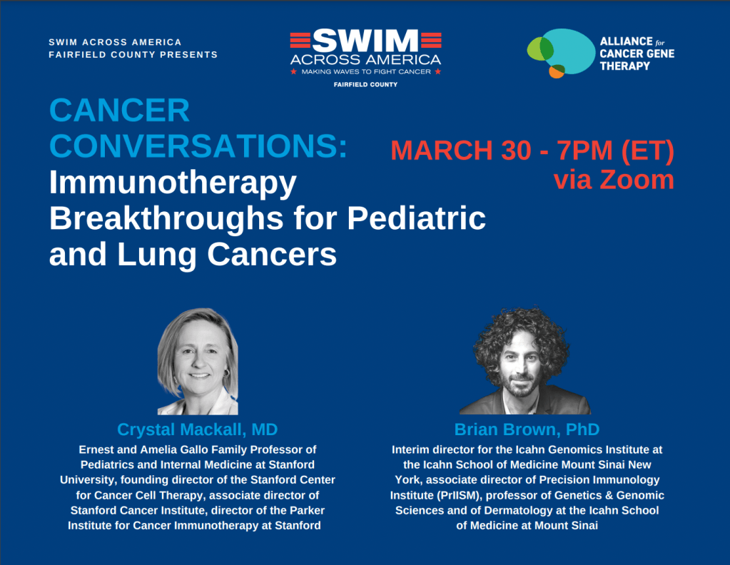 Thank you to SAA-Fairfield County and Alliance for Cancer Gene Therapy (ACGT) for hosting Cancer Conversation on Breakthroughs in Immunotherapy with ACGT research fellows funded by Swim Across America – Fairfield County, Dr. Crystal Mackall of Stanford University, and Dr. Brian Brown of the Icahn School of Medicine at Mount Sinai. They are both cancer scientist rockstars in their field.