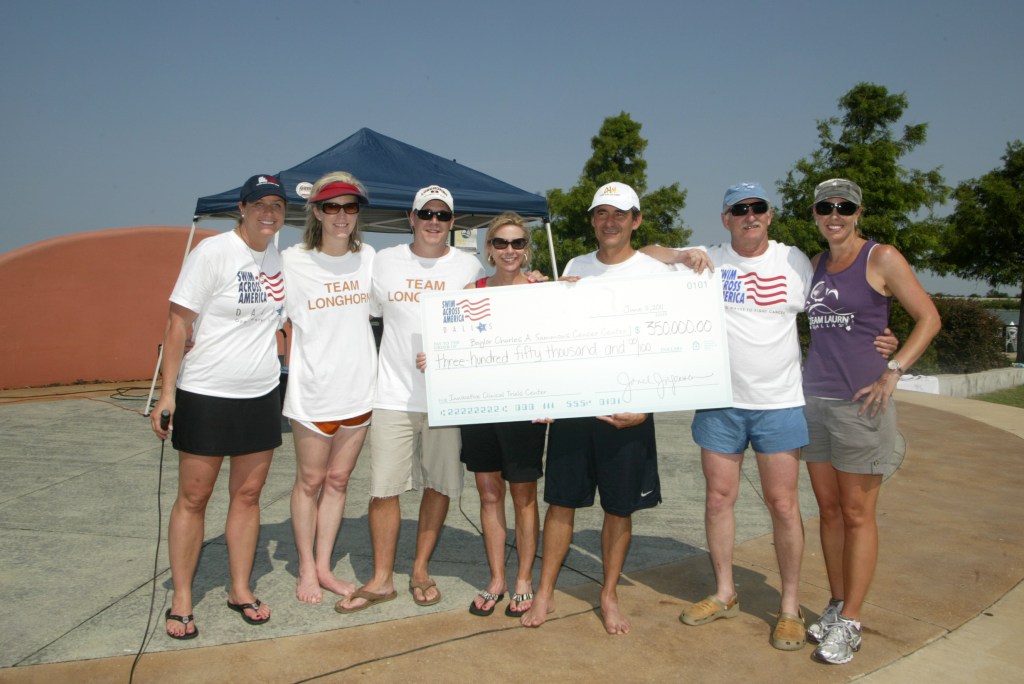 Swim Across America – Dallas held its inaugural event on Lake Ray Hubbard in the Spring of 2011, directed by University of Texas Swimming teammates Jeanne (Doolan) Cunningham, Andrea (Hayes) Dickson and Daniel Watters. Each of the event directors have family histories impacted by cancer and wanted to make a difference in the fight. Following an incredible adventure where swimmers from Texas and SMU teamed together to raise over $75,000 in the San Francisco swim as Team Tejas, they hoped to replicate the efforts in their home city of Dallas. With the help of then SAA President Janel Jorgensen (a teammate of Andrea and Daniel on the 1988 Olympic Team), SAA – Dallas would establish funding for Phase 1 clinical research at the Baylor Charles A. Sammons Cancer Center. $2.8 million dollars raised later and now funding the Swim Across America Innovative Clinical Trials Center at Baylor, the swim is still going strong under new leadership but still with the grateful support of Jeanne, Andrea, and Daniel.