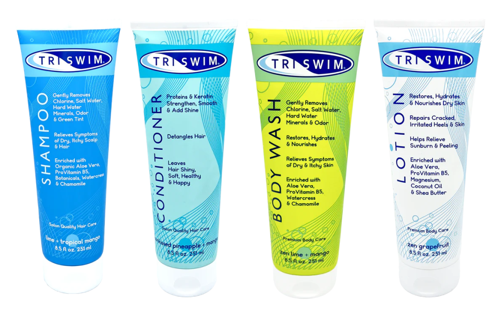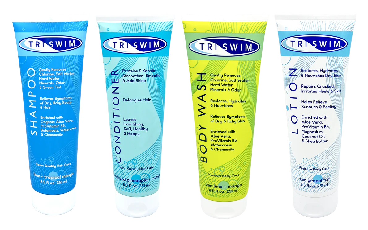 TRISWIM products help swimmers concentrate on workout, not the dry, itchies or smell which may come with it. Premium ingredients in the TRISWIM Chlorine Saltwater Removal Line work to gently and effectively neutralize and remove Chlorine, Saltwater, Hard Water Minerals, Bromine and chemical odor from your skin and hair. Moisturizes, soothes and restores with vitamins, botanicals, proteins and Keratin.
